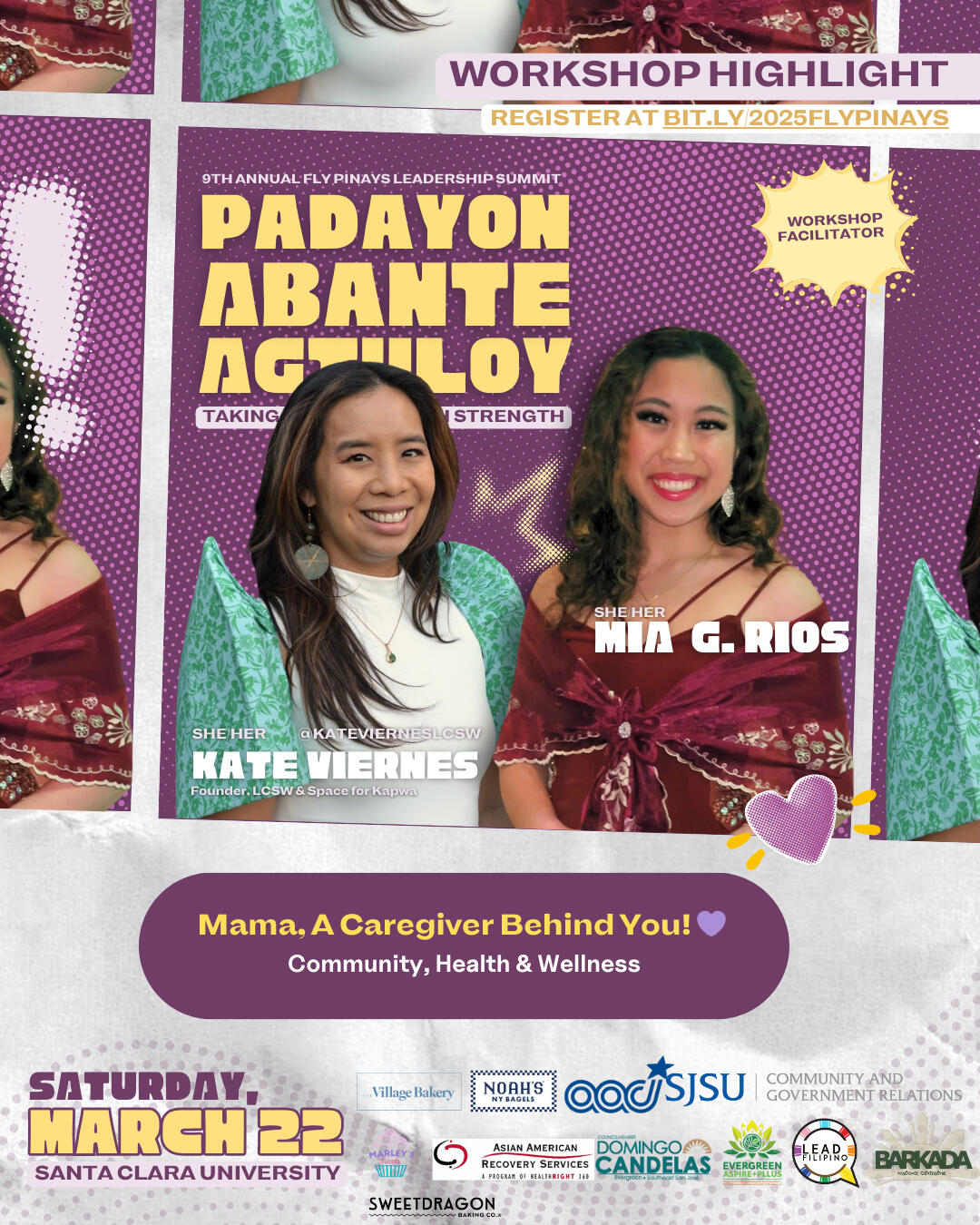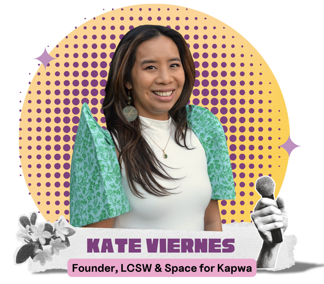 Workshop: Mama, A Caregiver Behind You! 💜Kate Viernes (she/her) was born on the Kānaka Maoli island of Oʻahu, Hawaiʻi and descends from emigrants from the Ilocos and Cagayan regions of the archipelago known today as "The Philippines." She is actively learning how to decolonize her mind, activities, parenting, and small group psychotherapy practice based out of Tamien and Ohlone territory (aka San José, CA). She enjoys using "parts work" on her personal healing journey as well as with her therapy clients, and she loves karaoke.Mia G. Rios (she/her) is a 23-year-old Filipina from San Jose, CA. She currently attends San Jose State University for her Master's in Social Work, in hopes of becoming a community social worker. Her social work interests include intergenerational trauma healing, family relationships, and multicultural mental health. Aside from being a grad school student, Mia is a singer-songwriter, poet, and performer. She has performed at various events across San Jose, such as LEAD Filipino’s FAHM Jam, Jeepney Jam, Fly Pinays, Flag Raising Ceremony, and SJ Made’s Pinoytown Artwalk. Mia is also a social justice advocate, being involved with Malaya Movement South Bay and LFS-SJSU, as well as an avid reader for political literature in her free time.